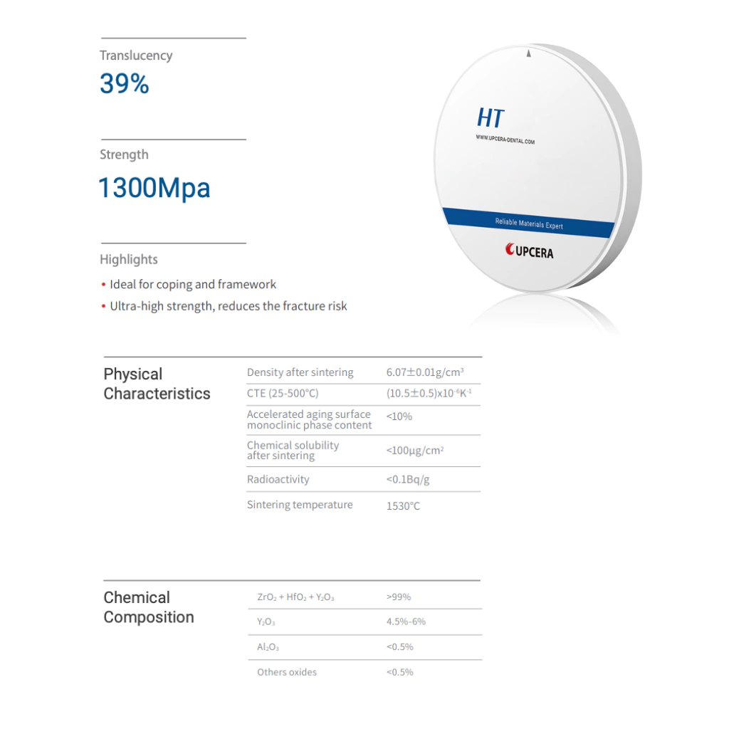 Hecho de zirconia 3Y-TPZ de alta translucidez, es ideal para restauraciones anteriores monolíticas o reducidas y estructuras de puentes con cerámica. Ofrece una excelente combinación de resistencia y estética.