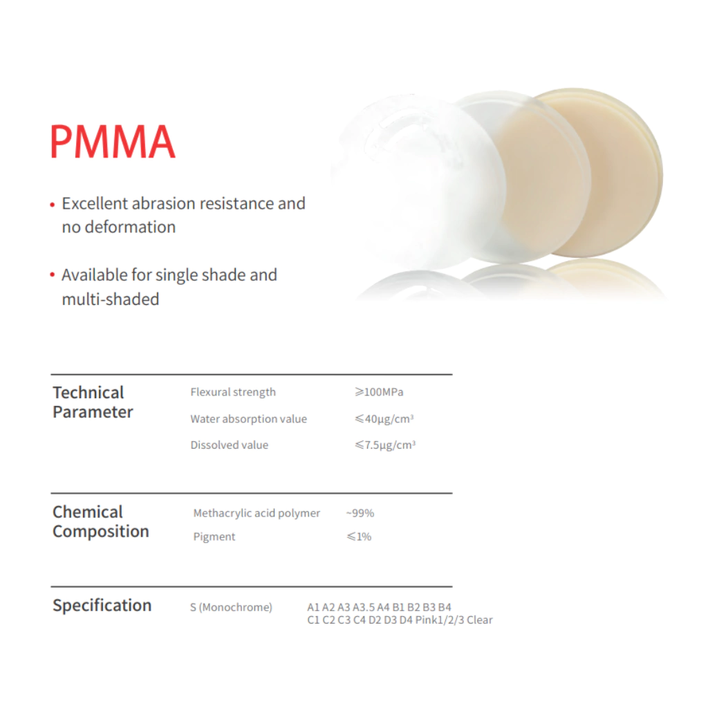 Excelente resistencia a la abrasión y sin deformación. Composición química: 99 % polímero de ácido metacrílico y 1 % pigmento.