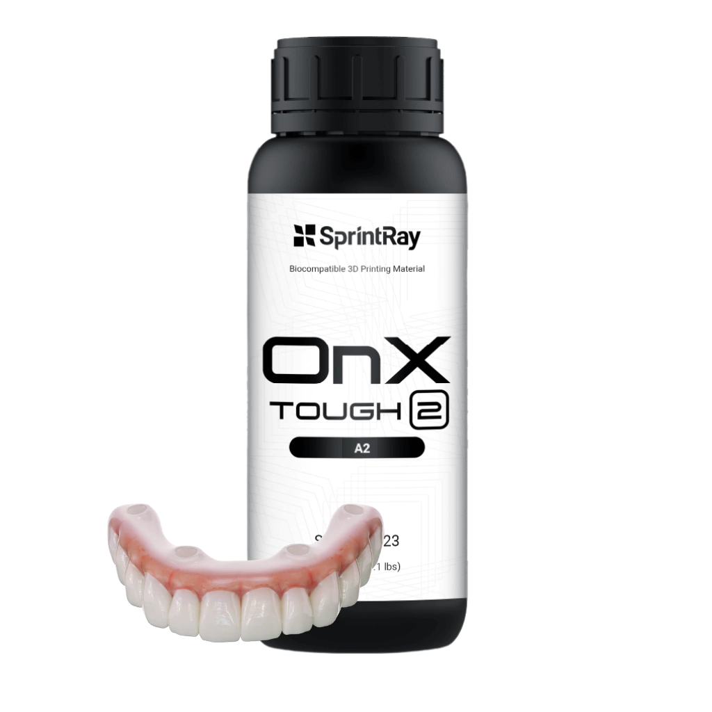 SprintRay OnX Tough 2, resina de impresión 3D dental aprobada por la FDA para su uso en dentaduras postizas híbridas fijas. Con tecnología NanoFusion™ que ofrece una durabilidad y calidad visual excepcional.